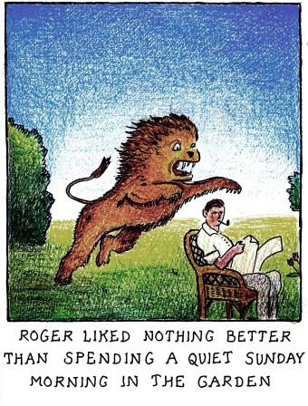 alt : dans un jardin anglais, un lion attaque Roger lisant tranquillement son journal en fumant la pipe dans un fauteuil en osier