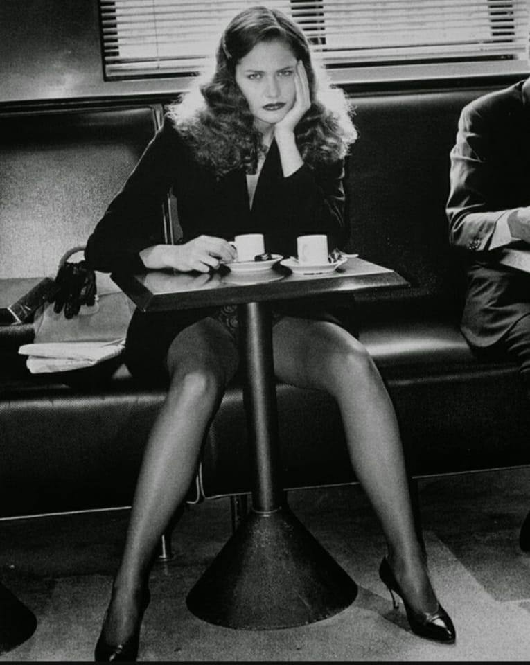 alt : Charlotte Rampling, assise nue à une table, tient son sein droit d'une main, sa cigarette de l'autre