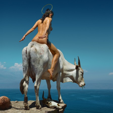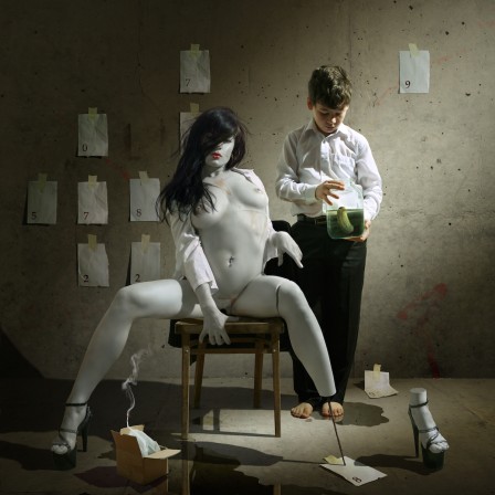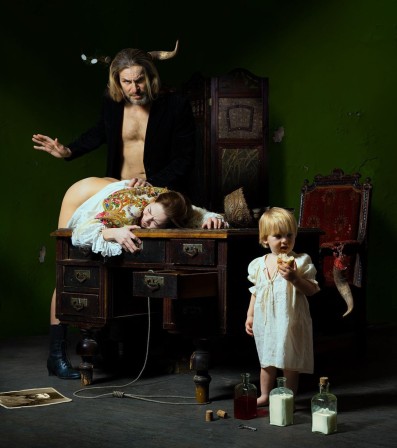alt : à l'arrière plan, monsieur (portant des cornes) donne une fessée à madame, au premier plan, un enfant blond tient un morceau de pain, à ses pieds, une carafe de lait