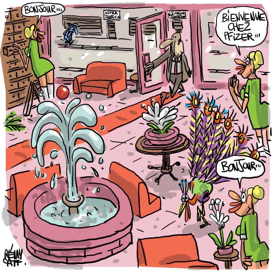 pendant ce temps, à la boutique Pfizer des Champs-Élysées : bonjour, je voudrais voir vos plus beaux vaccins, c'est pour offrir