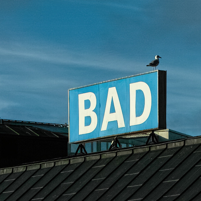 alt : debout sur l'enseigne lumineuse bleue "Bad" installée sur le toit d'un bâtiment, un oiseau fixe l'horizon de même couleur