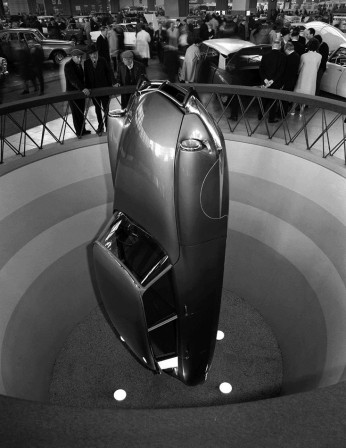alt : la Citröen DS au salon de l'automobile installée telle une fusée sur son pas de tir