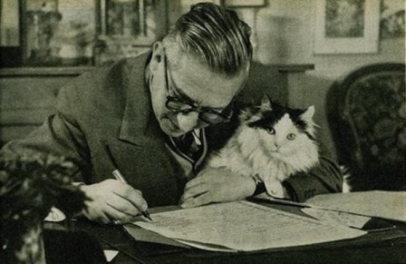 alt : 1946, Jean-Paul Sartre terminant la rédaction de son ouvrage "L'existentialisme est un humanisme", son chat sur ses genoux