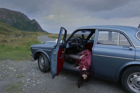 alt : sur un chemin de bord de mer, un ancien modèle de Volvo bleue arrêté, le corps de la conductrice brune pendant par la porte ouverte, la tête près du gravier, les yeux ouverts