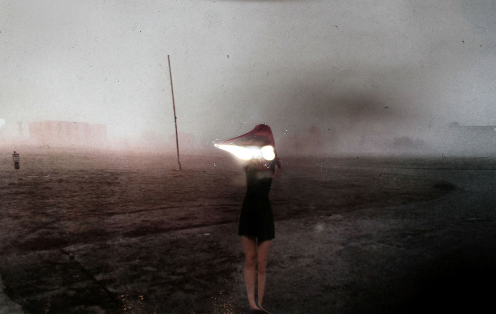 alt : un trou de lumière sur la photographie d'une femme aux cheveux rouges en petite robe noire, debout pieds nus dans la boue du chemin traversant la campagne déserte embrumée
