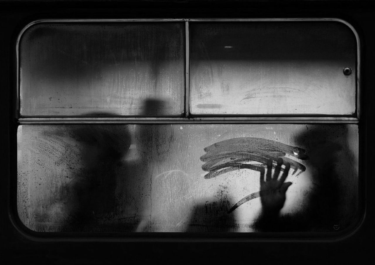 alt : une main tente d'effacer la buée ou la crasse sur la vitre d'un véhicule de transport en commun pour voir dehors