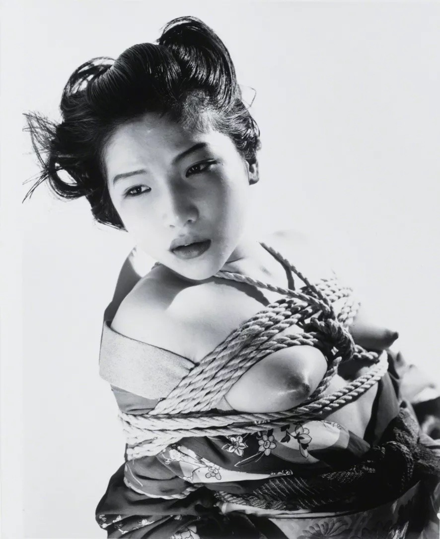 alt : le regard détourné d'une femme prise dans les cordes du bondage, les seins nus tendus par les liens