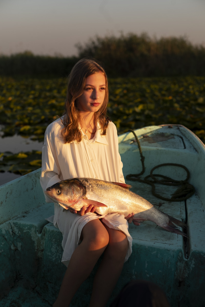 alt : soleil levant sur poisson entre les mains de la fille du pêcheur