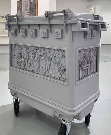 tags : journées du patrimoine, recyclage, tri des déchets, poubelle grise pour les oeuvres d'art, sortez les poubelles, bas-relief de repas