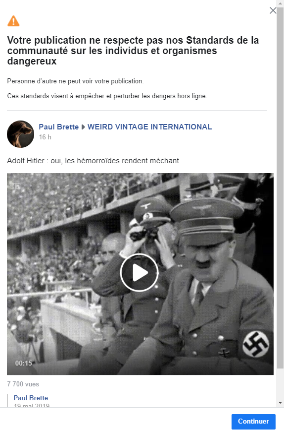 encore 30 jours de blocage sur facebook par le lobby des hémorroïdaires anonymes pour irrespect vis-à-vis des grandes figures de l'Histoire et des victimes de crise d'hémorroïdes