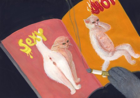 alt : dans une nuit étoilée, tournant le dos à un chat noir lorgnant la cage des oiseaux, un chat blanc debout tient comme une offrande un rat entre ses pattes