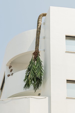 alt : sur un immeuble blanc au soleil, un palmier pend