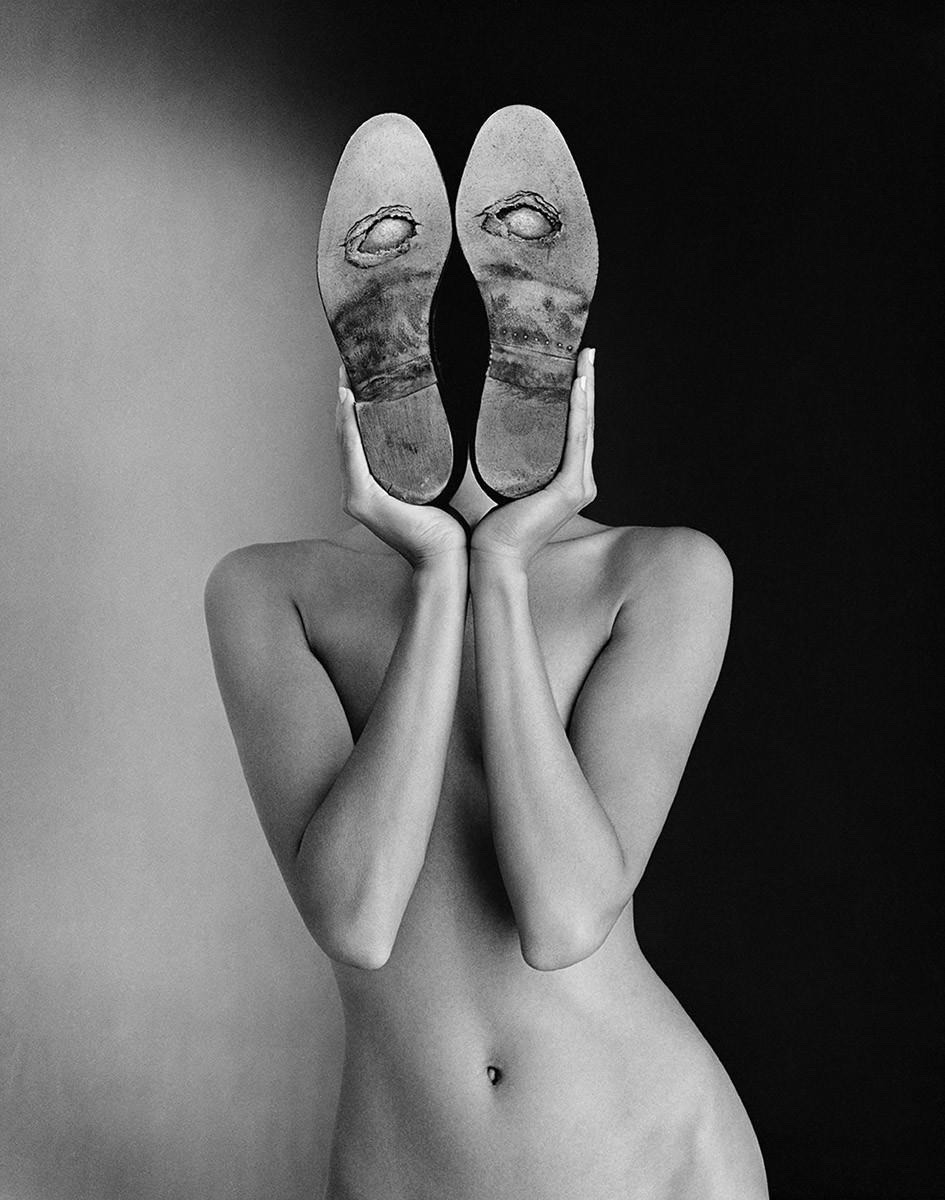 alt : Marianne dévêtue tient devant son visage deux chaussures aux semelles percées dont les trous sont ses yeux peints